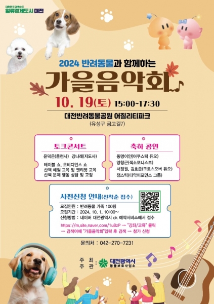 가을음악회에 참여하고 싶은 반려동물 가족은‘대전OK예약서비스’에서 10월 1일부터 13일까지 예약 신청을 하면 된다.