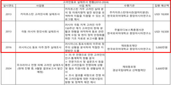 실제로 이재강 의원실이 재외동포청으로부터 제출받아 확인한 자료에 따르면 재외동포청은 2024년 우크라이나-러시아 전쟁이라는 특수 상황에서 실시한 조사를 제외하고는 고려인동포법이 제정된 2010년 이후로 단 세 번의 실태조사만을 진행했고 해당 자료를 바탕으로 현재의 동포 지원사업을 집행하고 있었다.