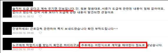 한 온라인 카페에서 노동부의 특별근로감독에 대한 문의하는 글에 달린 댓글을 보면, ‘솔직히 도급 없다고 계속 우기면 안보인다’, ‘ 누구에게 작업지시를 받는지 확인은 한다, 추후에는 어떤 식으로 계약을 해야한다 정도로 끝났다’ 고 답했다.