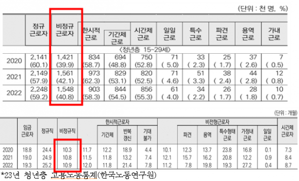 한국노동연구원의 23년 청년층 고용노동통계를 보면, 15세에서 29세까지 청년 40.8%는 비정규직이고 이들의 평균 근속기간은 10.9개월로 나타났다.