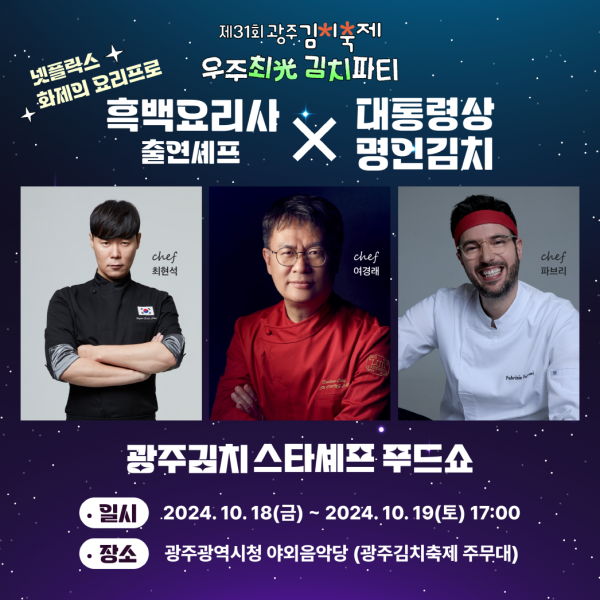 주재희 경제창업국장은 “매년 새로운 콘텐츠를 선보이는 광주김치축제가 이번에는 광주명인김치를 활용한 새로운 푸드쇼를 준비했다”며 “광주김치를 재해석한 유명셰프들의 새로운 요리는 방문객들에게 새로운 경험을 선사해 ‘미식 광주’의 명성을 더욱 높일 것으로 기대된다”고 말했다.