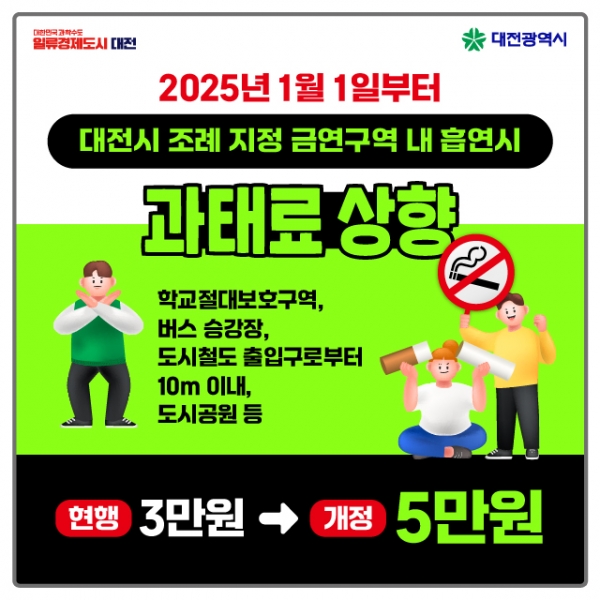 [국회의정저널] 대전시는 ‘금연구역 지정 등 흡연피해 방지 조례’일부 개정에 따라 조례에서 지정한 금연구역에서 흡연 시 부과하는 과태료를 2025년 1월 1일부터 기존 3만원에서 5만원으로 상향 적용한다.