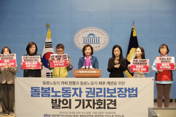 한편 이수진 국회의원과 노동시민단체는 돌봄의 공공성과 보편성 등 돌봄정책의 기본원칙과 방향을 정하는 돌봄기본법을 준비하고 있다며 곧 발의를 추진할 것임을 예고했다.