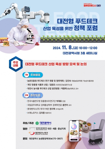 [국회의정저널] 대전시는 8일 오전 10시 대전시청 세미나실에서 ‘푸드테크 정책포럼’을 개최한다.