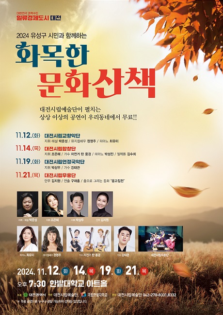 [국회의정저널] 대전시립예술단은 이달 12일부터 2주간에 걸쳐 화요일과 목요일 오후 7시 30분에 유성구 한밭대학교 아트홀에서 시민을 위한 ‘화목한 문화 산책’ 공연을 연다.