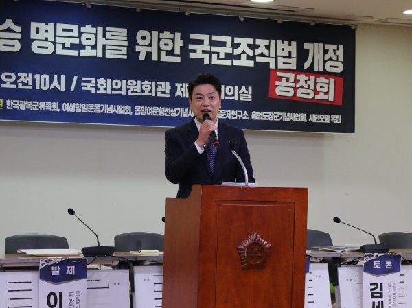 부승찬 의원은 환영사를 통해 “1907년 대한제국군이 해산된 이후 우리 107년간 우리 군이 뿌리를 세우지 못하고 있는 참담한 상황이다”며 “오늘 공청회를 통해 우리 국군의 자랑스러운 역사가 정립되고 우리 군이 ‘국민의 군대’로서 더 이상 불필요한 역사논쟁에 휘말리지 않길 바란다”고 말했다.