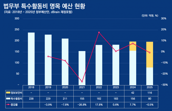 이로써 22년 182억원, 23년 183억원, 24년 법무부의 특수활동비와 정보보안비 합계 197억원, 2025년에는 196억원으로 사실상 예산이 증액되어 왔다.