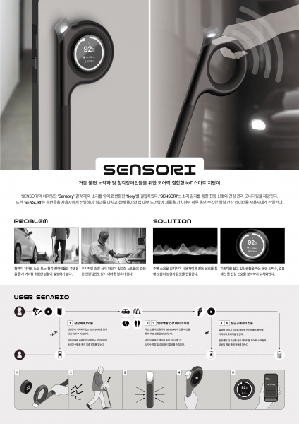 대상인 'SENSORI'는 청각 장애인을 타깃으로 스마트 보조 보행 지팡이를 통해 문제점을 해결하는 솔루션 아이디어다.
