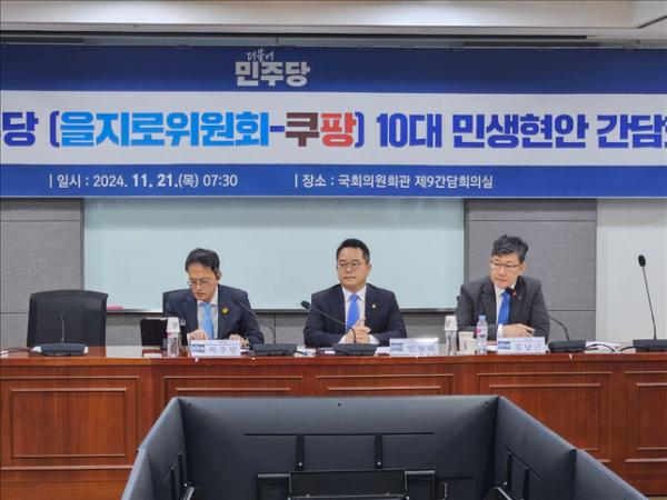 이날 간담회에는 더불어민주당 ’쿠팡 TF‘ 소속의원과 쿠팡 강한승·박대준 공동대표, 정종철 쿠팡CFS 대표, 홍용준 CLS대표 등이 참석했다.