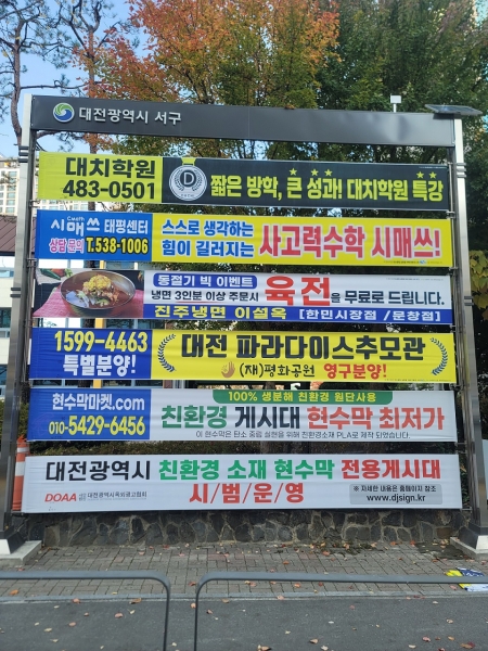 [국회의정저널] 대전시는 기후 위기 시대에 온실가스를 감축하고 환경오염과 자원 낭비를 예방하기 위해 옥외광고물 분야 친환경 소재 현수막 전용 게시대를 본격도입한다.