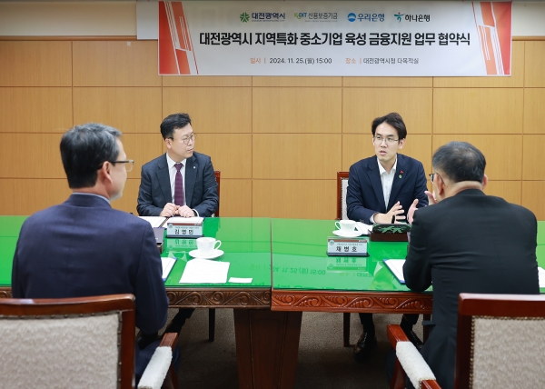 이날 협약식에는 장호종 대전시 경제과학부시장과 채병호 신용보증기금 신용사업부문 이사, 김영민 우리은행 대전충청남부 영업본부 본부장, 함종덕 하나은행 대전세종영업본부 지역대표가 참석해 금융지원을 위한 구체적인 실행 계획을 논의했다.