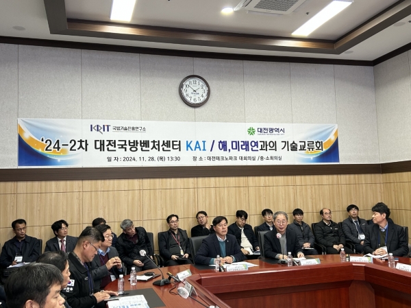 [국회의정저널] 대전시는 28일 대전테크노파크 어울림프라자에서 한국항공우주산업 미래융합기술원 및 해군 미래혁신연구단과 ‘대전국방벤처센터 협약기업 기술교류회’를 개최했다.