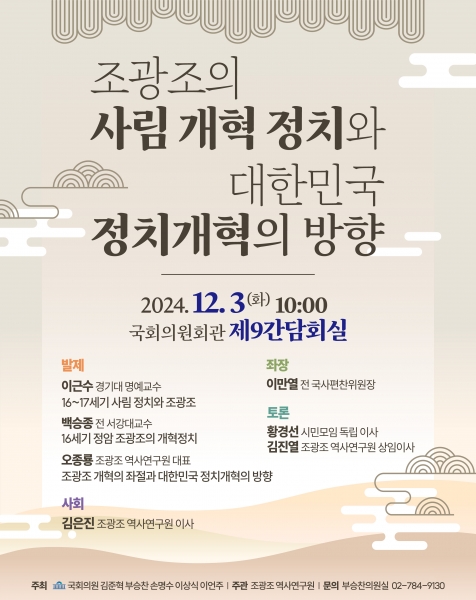 부승찬 의원은 “새로운 시대정신이 요구되는 지금, 조광조 선생의 개혁정신은 우리가 앞으로 나아가야 할 방향을 제시해준다”며 이번 토론회가 “조광조 선생의 사상과 실천이 우리 사회의 새로운 희망과 가능성을 여는 소중한 논의의 장이 되길 바란다”고 개최 배경을 설명했다.