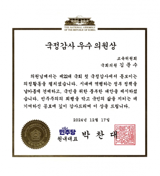 김문수 의원은 “첫 국정감사인만큼 부족한 점도 많았지만, 보좌진과 교육계, 학생단체, 교사단체, 교수단체들의 협력을 통해 의미 있는 성과를 낼 수 있었다”며 “국정감사 우수의원상 수상을 더 잘하라는 채찍으로 알고 교육의 공공성과 균형발전을 위해 더욱 노력하겠다”고 소감을 밝혔다.