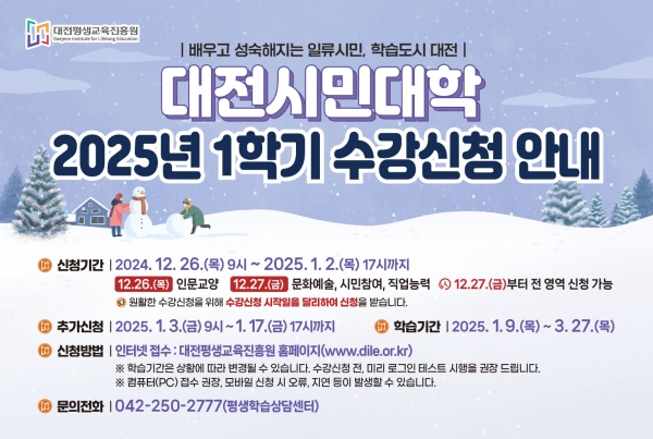[국회의정저널] 대전평생교육진흥원은 대전시민대학 2025년도 1학기 평생학습 프로그램 수강생을 12월 26일 오전 9시부터 1월 2일 오후 5시까지 선착순 모집한다.