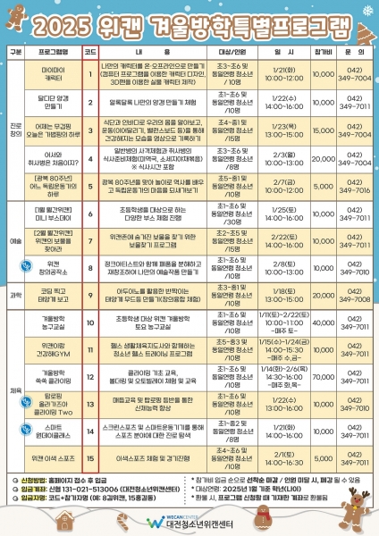 [국회의정저널] 대전시는 겨울방학을 맞아 청소년들을 대상으로 평송청소년문화센터와 대전청소년위캔센터에서 다채로운 프로그램을 운영한다.