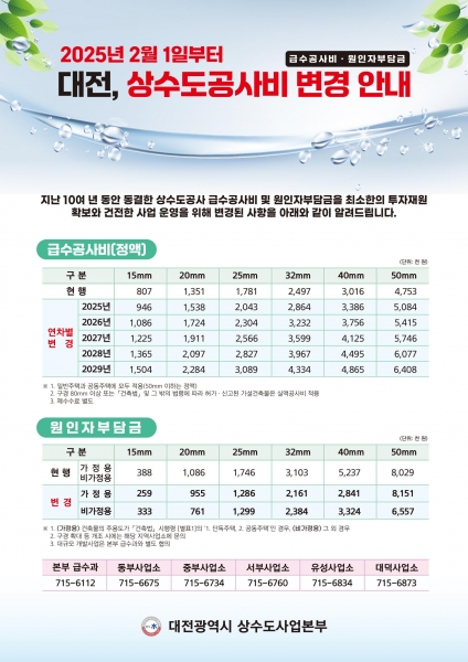 [국회의정저널] 대전광역시 상수도사업본부는 상수도 정액급수공사비와 원인자부담금을 2025년 2월 1일 자로 변경 고시한다.