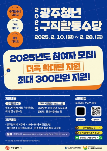광주광역시는 지역 미취업청년을 대상으로 구직활동에 필요한 비용과 다양한 역량강화 프로그램을 지원하는 ‘광주 청년 구직활동수당 지원사업’을 강화해 추진한다.