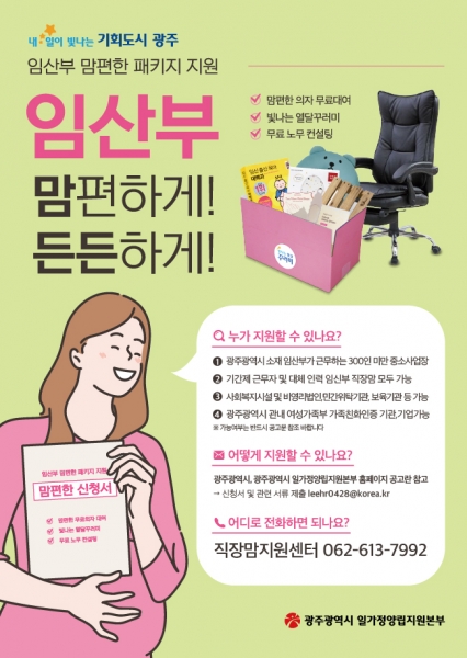 [국회의정저널] 광주광역시는 지역 중소사업장에 근무하는 임산부들의 근무환경 개선을 위해 ‘맘편한 패키지 지원사업’을 펼친다.