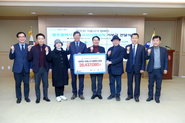 광주광역시는 18일 시청 비즈니스룸에서 ‘따뜻한 겨울나기 캠페인 성금모금 전달식’을 개최하고 광주광역시·구 기독교단협의회가 모금한 성금 2843만7000원을 광주사회복지공동모금회에 기탁했다고 밝혔다.