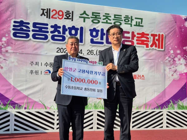 [국회의정저널] 함양 위림초등학교 총동창회와 수동초등학교 총동창회는 지난 26일 각 모교에서 열린 총동창회 행사에서 고향사랑기부금을 100만원씩을 기탁하며 고향에 대한 깊은 애정을 전했다.
