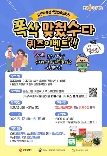 지원 대상은 임산부 또는 2025년 1월 1일 이후 출산한 가정이며 ‘광주아이키움’ 플랫폼을 통해 간단한 퀴즈를 풀고 임신확인서 아기수첩 등 증빙서류를 제출하면 된다.
