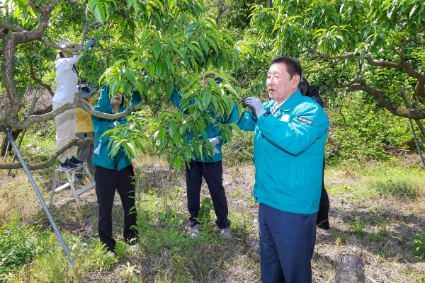 5월 14일 대산면 대사리에 위치한 복숭아 열매 솎기 작업 현장을 찾아 농촌일손돕기를 실시했으며 이날 조근제 군수를 비롯한 농업기술센터 직원들이 함께 참여해 현장 지원을 나섰다.