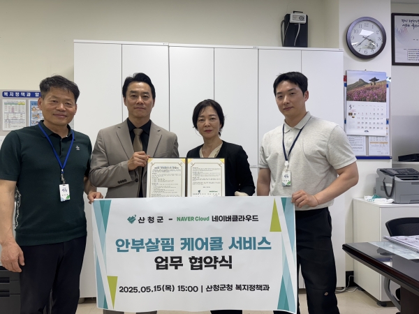 [국회의정저널] 산청군은 지난 15일 군청에서 네이버클라우드㈜와 ‘안부살핌 케어콜 서비스 업무협약’을 체결했다고 16일 밝혔다.