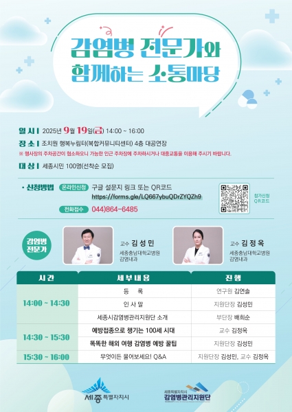 [국회의정저널] 세종시 감염병관리지원단이 오는 19일 오후 2시 조치원 행복누림터 4층 대공연장에서 ‘2025년 감염병 전문가와 함께하는 소통마당’을 개최한다.