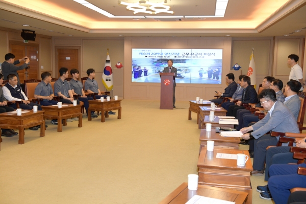 광주광역시는 8일 오전 10시30분 시청 비즈니스룸에서 ‘캐스퍼 20만대 양산 기념 근무유공자 표창 수여식’을 열어 GGM 임직원들의 노고를 격려했다.