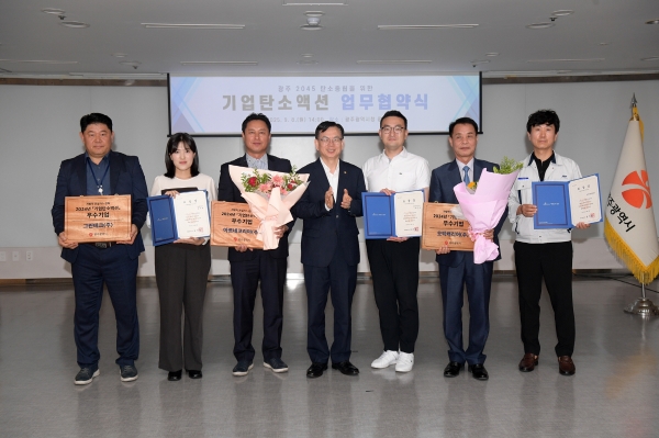 한편 광주시는 이날 협약식에서 ‘2024년 기업탄소액션 우수 참여기업’ 으로 선정된 △그린테크㈜ △오텍캐리어㈜ △아르네코리아㈜ 등 3개 기업에 대해 광주광역시장 표창과 현판을 수여했다.