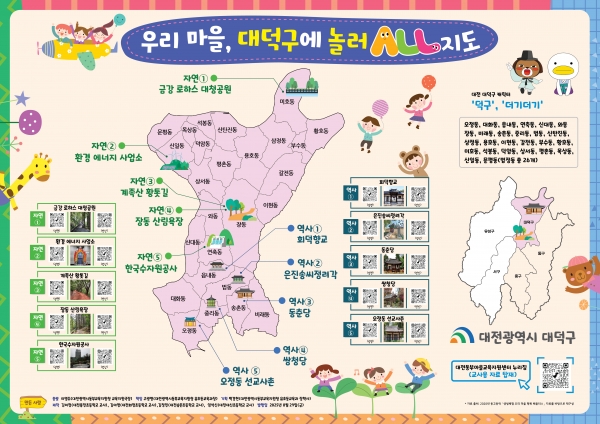‘우리 마을에 놀러올 지도’는 동부교육지원청 유초등교육과 동부마을교육지원센터에서 제작한 자료로 대전 동부 지역 내 교육적 가치가 높은 자연생태 및 역사 탐방 체험 장소를 한눈에 확인할 수 있도록 구성한 지도 자료다.