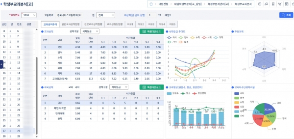 또한, 고등학교에서 이수한 교과목 현황을 분석해 학기별·교과군별로 표와 그래프로 제공해, 학생이 지원하고자 하는 대학에 맞춰 이수가 필요한 교과목에 대한 상황을 쉽게 파악할 수 있게 해준다.