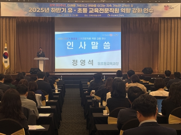 [국회의정저널] 경북교육청은 29일 경주시에 있는 더케이호텔경주에서 본청과 직속기관·교육지원청 소속 유·초등 교육전문직원 160여명이 참석한 가운데 ‘2025 하반기 유·초등 교육전문직원 역량 강화 연수’를 개최했다고 밝혔다.