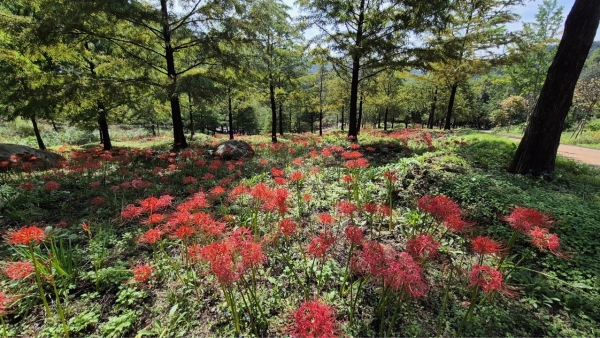 상록수 숲길과 어우러진 꽃무릇이 산책길을 물들이며 정자와 쉼터, 야간 조명도 설치돼 있어 낮과 밤 모두 즐기기 좋은 산책 코스다.