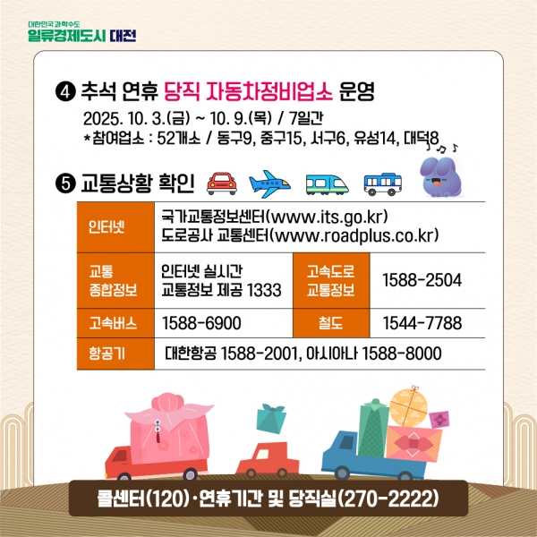 장거리 운행 중 고장에 대비해 동구·중구·서구·유성구·대덕구에서 총 52개 당직 자동차정비업소가 운영되며 운수종사자를 대상으로 한 교통안전·친절교육과 교통시설물 사전 점검도 이미 완료됐다.