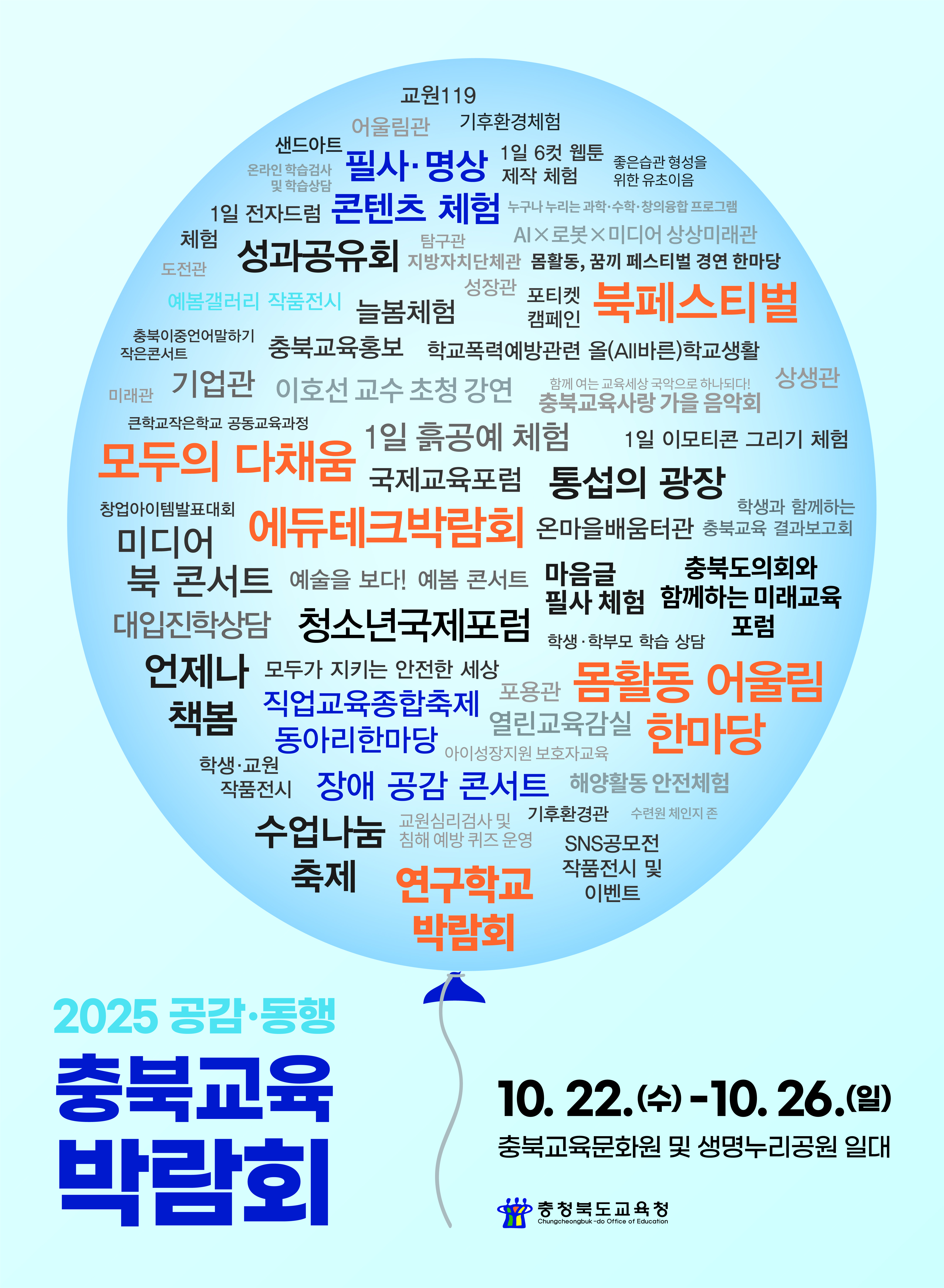 [국회의정저널] 충청북도교육청(교육감 윤건영)은 오는 22일(수)부터 26일(일)까지 5일간 ‘17만의 숨결, 꿈결 바람결’이라는 슬로건 아래 충북교육의 현재를 공유하고 미래 교육의 방향을 체험하는 통합형 교육박람회인 2025 공감·동행 충북교육박람회를 개최한다고 밝혔다.