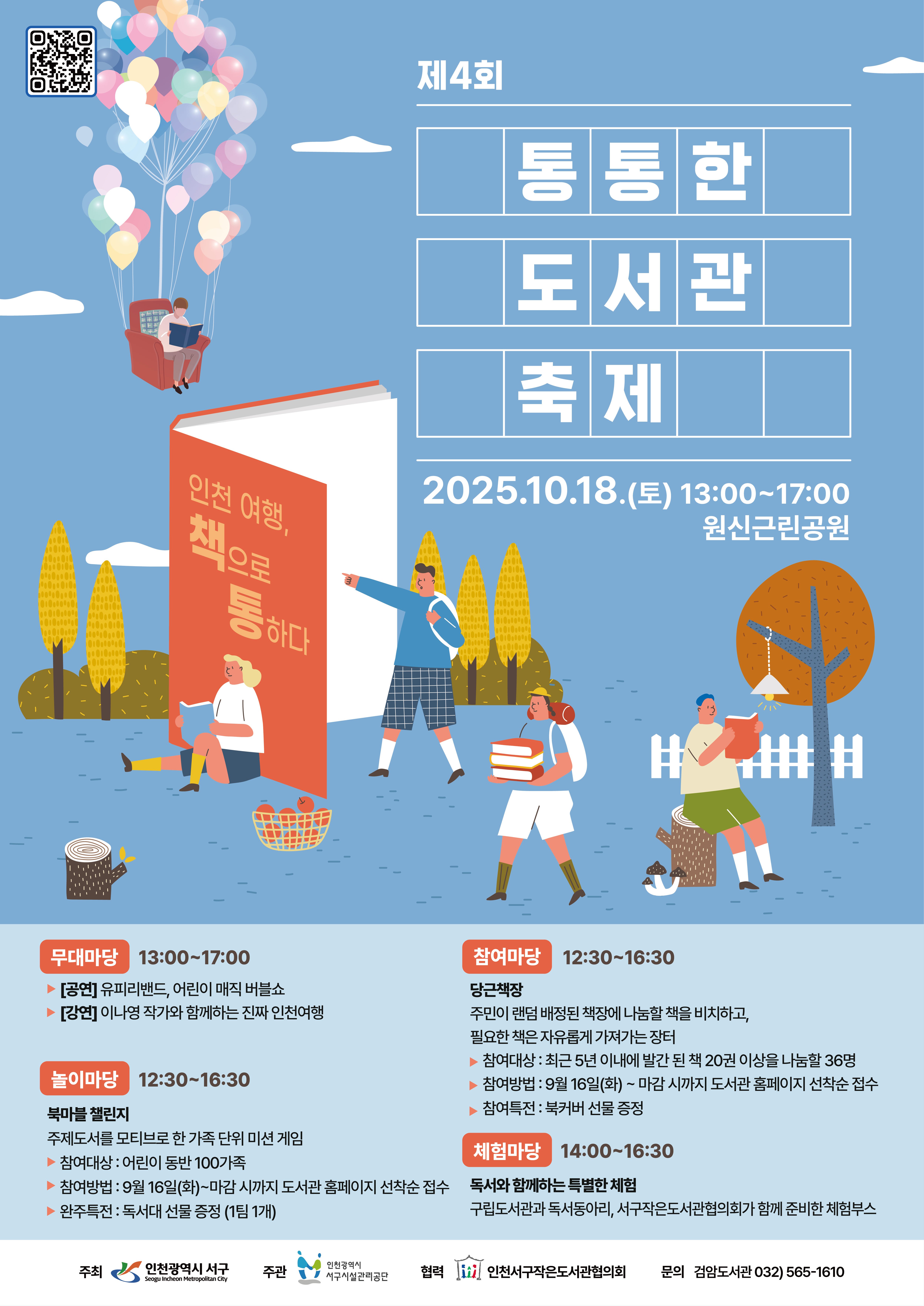 10월 18일(토) 오후 1시~오후 5시에 열리는 ‘제4회 통통한 도서관 축제’에서는 ‘인천 여행, 책으로 통하다’라는 주제로 총 4개(무대마당, 놀이마당, 참여마당, 체험마당)의 행사를 진행한다.