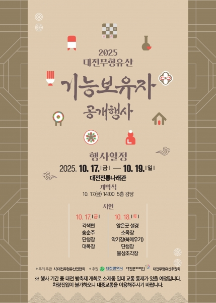 [국회의정저널] 대전시는 17일부터 19일까지 사흘 동안 대전전통나래관에서 ‘2025년 무형유산 기능보유자 합동공개행사’를 개최한다.