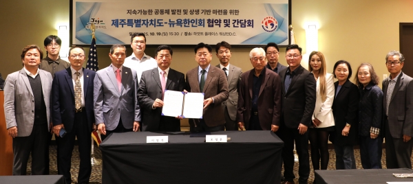 제주도는 19일 오후 4시 미국 워싱턴DC 소재 하얏트 플레이스 호텔에서 뉴욕한인회와 상생 교류발전 업무협약을 체결했다.