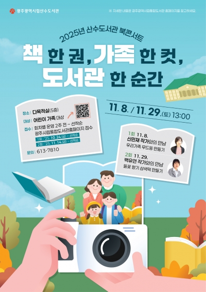 산수도서관을 이용하는 어린이 가족은 누구나 참여할 수 있으며 참가 신청은 10월 24일부터 광주시립도서관 누리집을 통해 선착순 접수한다.