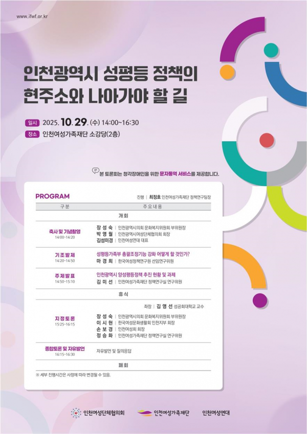 [국회의정저널] 인천여성가족재단은 오는 10월 29일 ‘인천광역시 성평등 정책의 현주소와 나아가야 할 길’을 주제로 ‘2025 양성평등 의제토론회’를 개최한다.