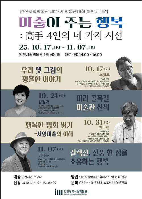 김태익 인천시 시립박물관장은 “이번 강연은 파리의 대형 미술관이 아닌, 골목 속 작은 미술관을 통해 시민들이 미술의 새로운 행복을 발견할 수 있도록 기획했다”며 “현장 전문가의 생생한 이야기로 미술을 삶 가까이에서 느낄 수 있는 특별한 시간이 될 것”이라고 전했다.