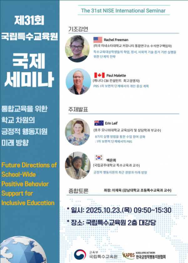 이번 국제세미나는 미국, 캐나다, 호주, 한국의 전문가가 각 국가의 학교 현장에서 이루어지고 있는 최근의 연구와 실천 전략을 공유하며 함께 미래 방향을 모색하는 자리가 될 것이다.