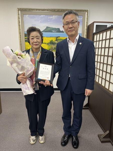 제주도는 24일 오후 도청 행정부지사실에서 이신숙 씨에게 감사패를 전달했다.