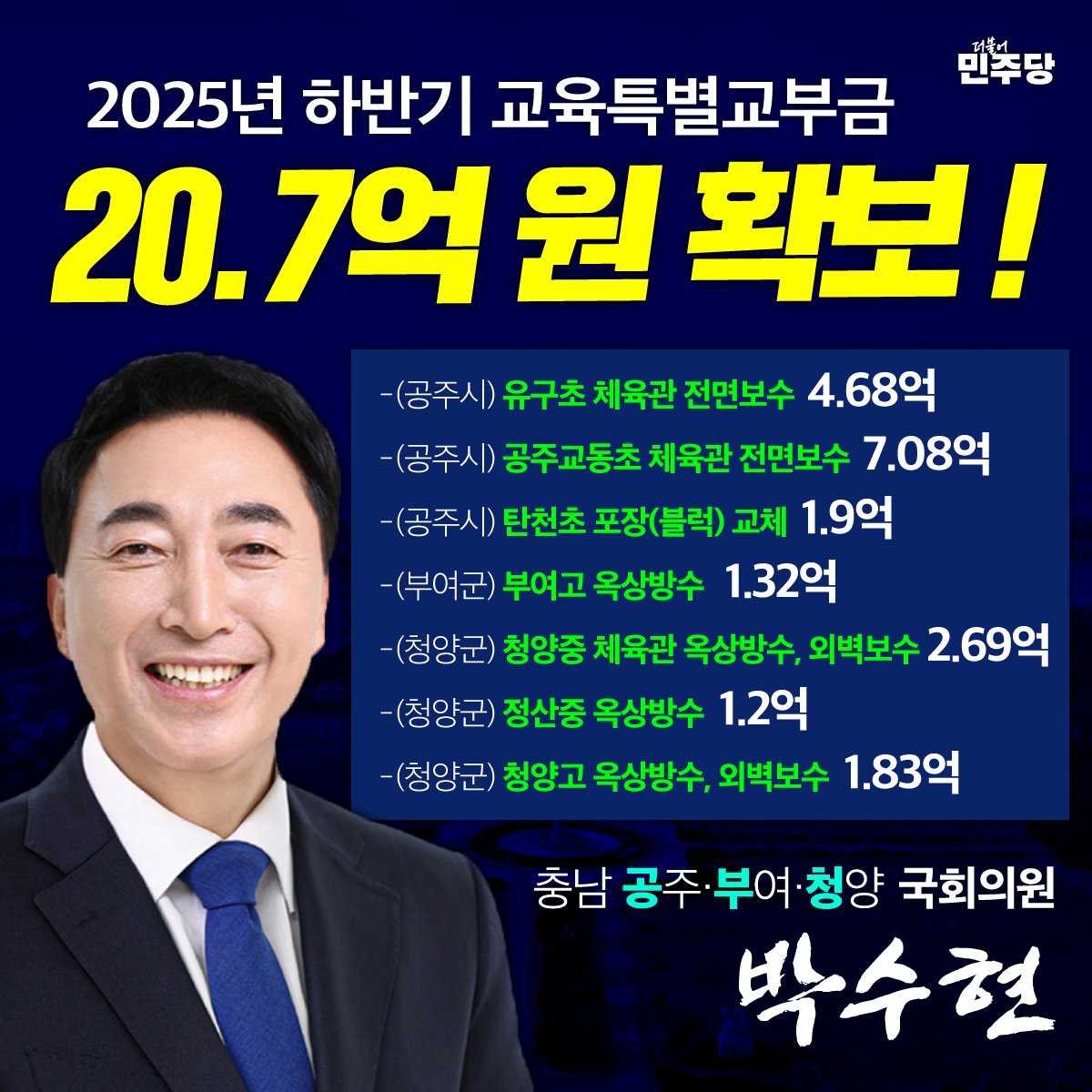[국회의정저널] 박수현 국회의원(더불어민주당·공주·부여·청양)이 교육부 '지역 교육현안 특별교부금'총 20억 7천만원을 확보했다.