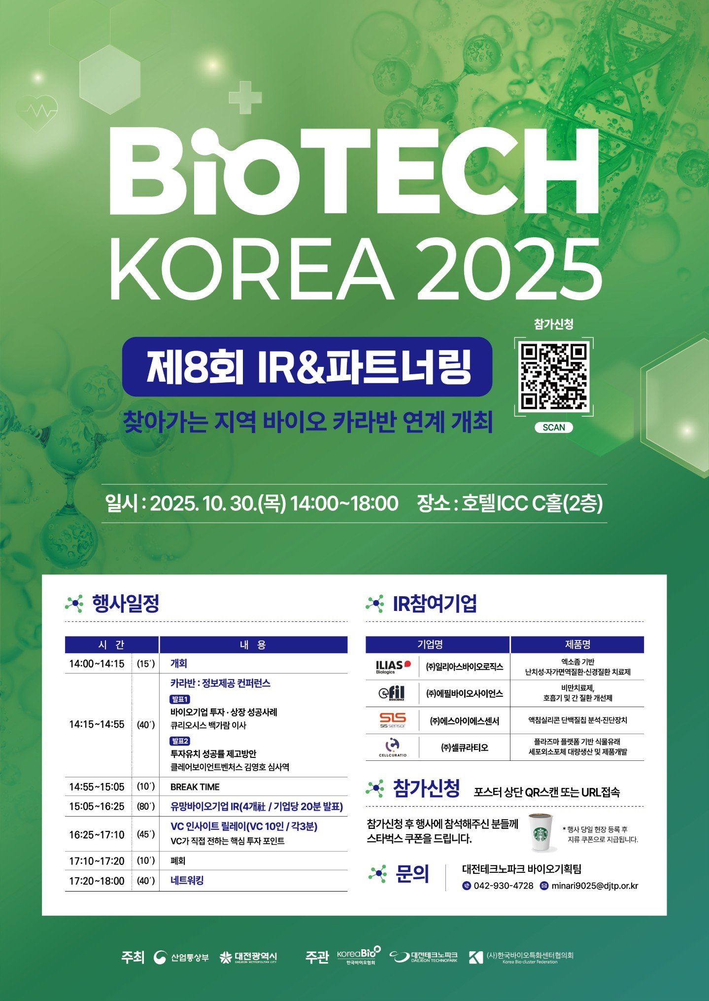 대전시 관계자는 “향후에도 민간 투자 연결과 초기 바이오기업 육성을 목표로 정보 및 협력 네트워킹 기회 제공 등 지역 바이오 기업들이 지속적으로 성장할 수 있는 다양한 지원방안을 모색하겠다”고 말했다.