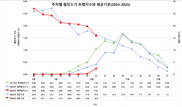 2025년 43주차에 평균기온 15.9℃로 떨어짐으로써 털진드기의 발생이 증가하는 양상을 확인했다.