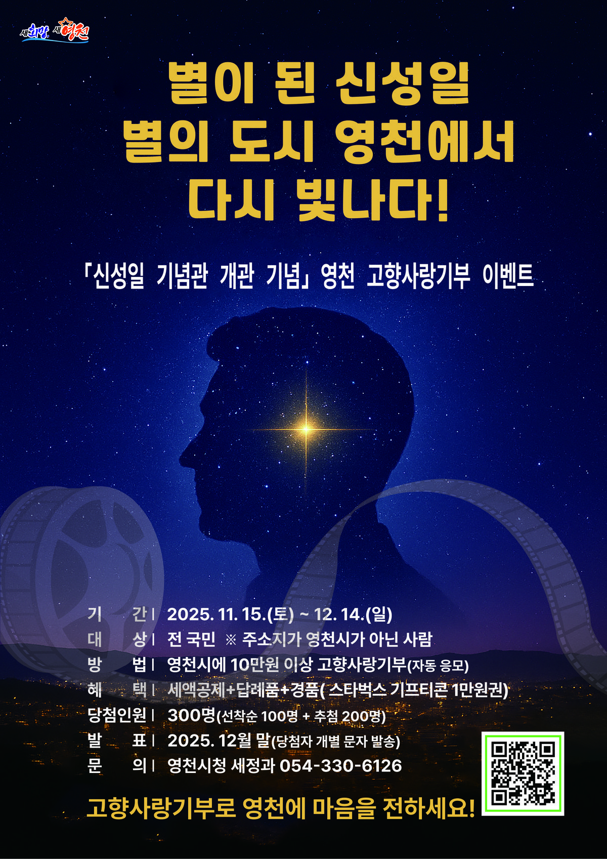 [국회의정저널] 영천시는 신성일 기념관의 정식 개관을 기념해, 11월 15일부터 12월 14일까지 한 달간 ‘고향사랑기부 특별 이벤트’를 진행한다고 밝혔다.