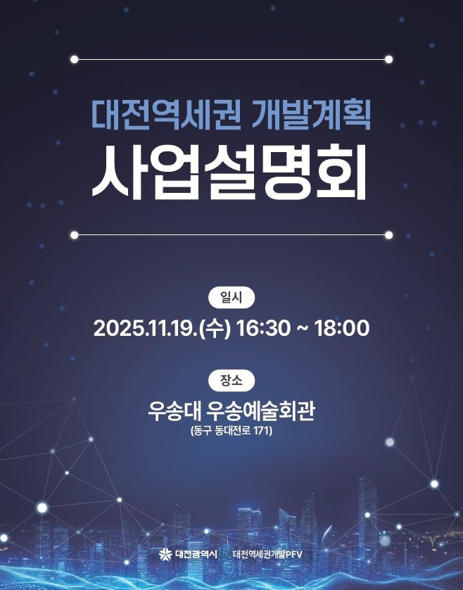 이번 사업설명회는 본격적인 사업 추진을 앞두고 사업 추진 현황과 계획을 공유하는 자리로, 대전시와 ㈜대전역세권개발PFV가 공동으로 주최하고 이장우 대전시장, ㈜대전역세권개발PFV, 지역의원, 한국철도공사 등 관계기관, 지역 건설업계, 상인연합회, 주민 등 다수가 참석할 예정이다.